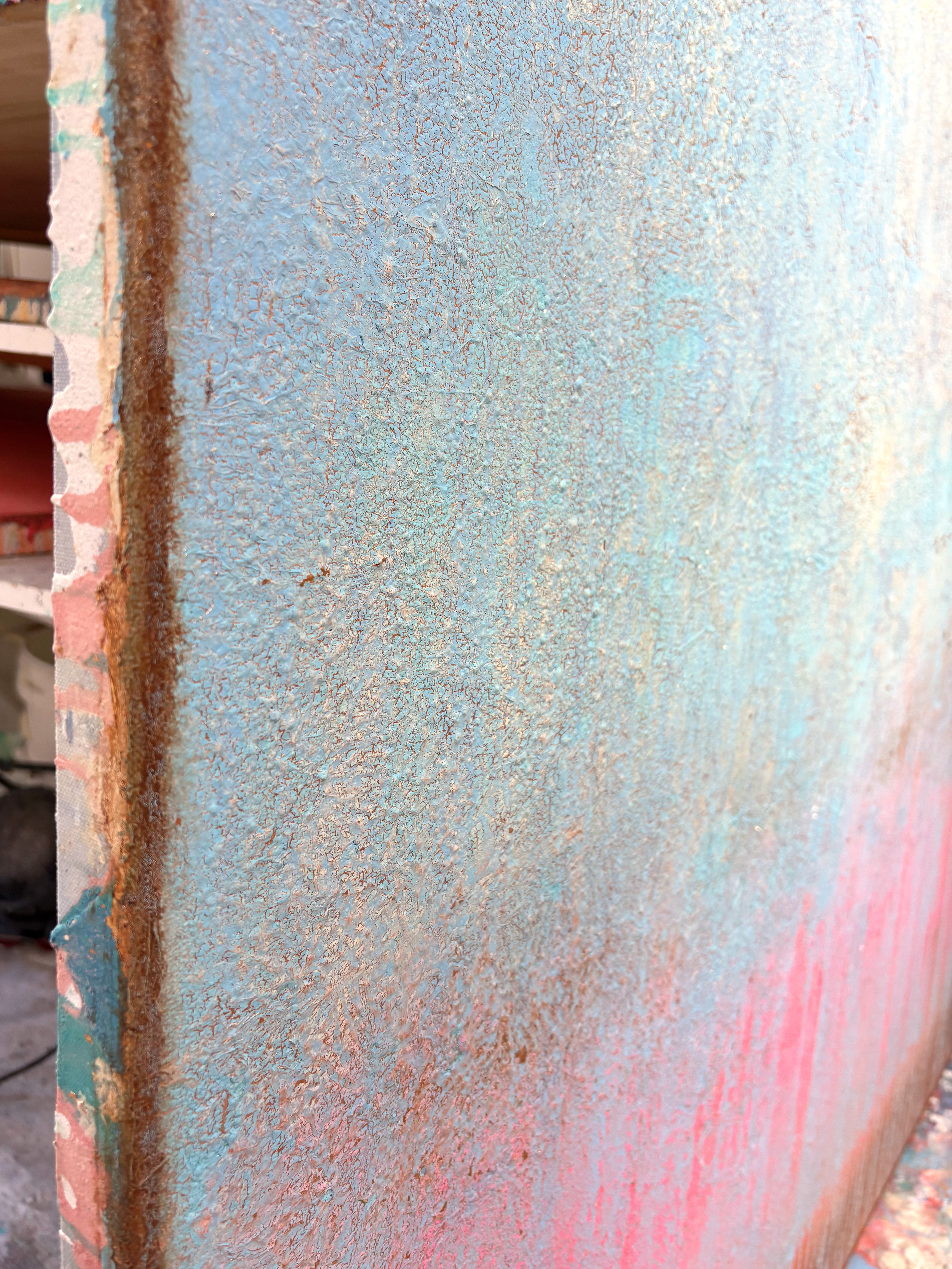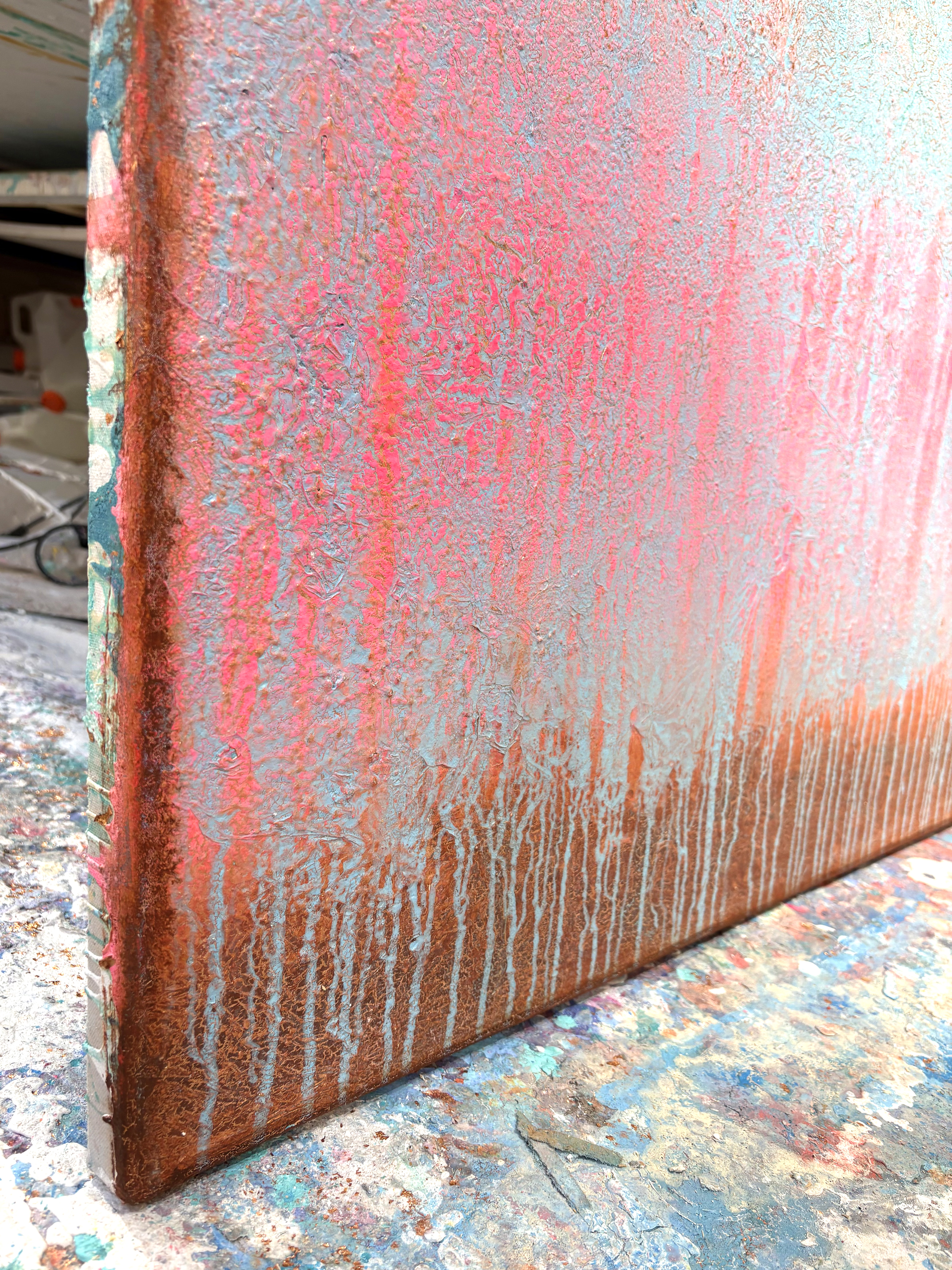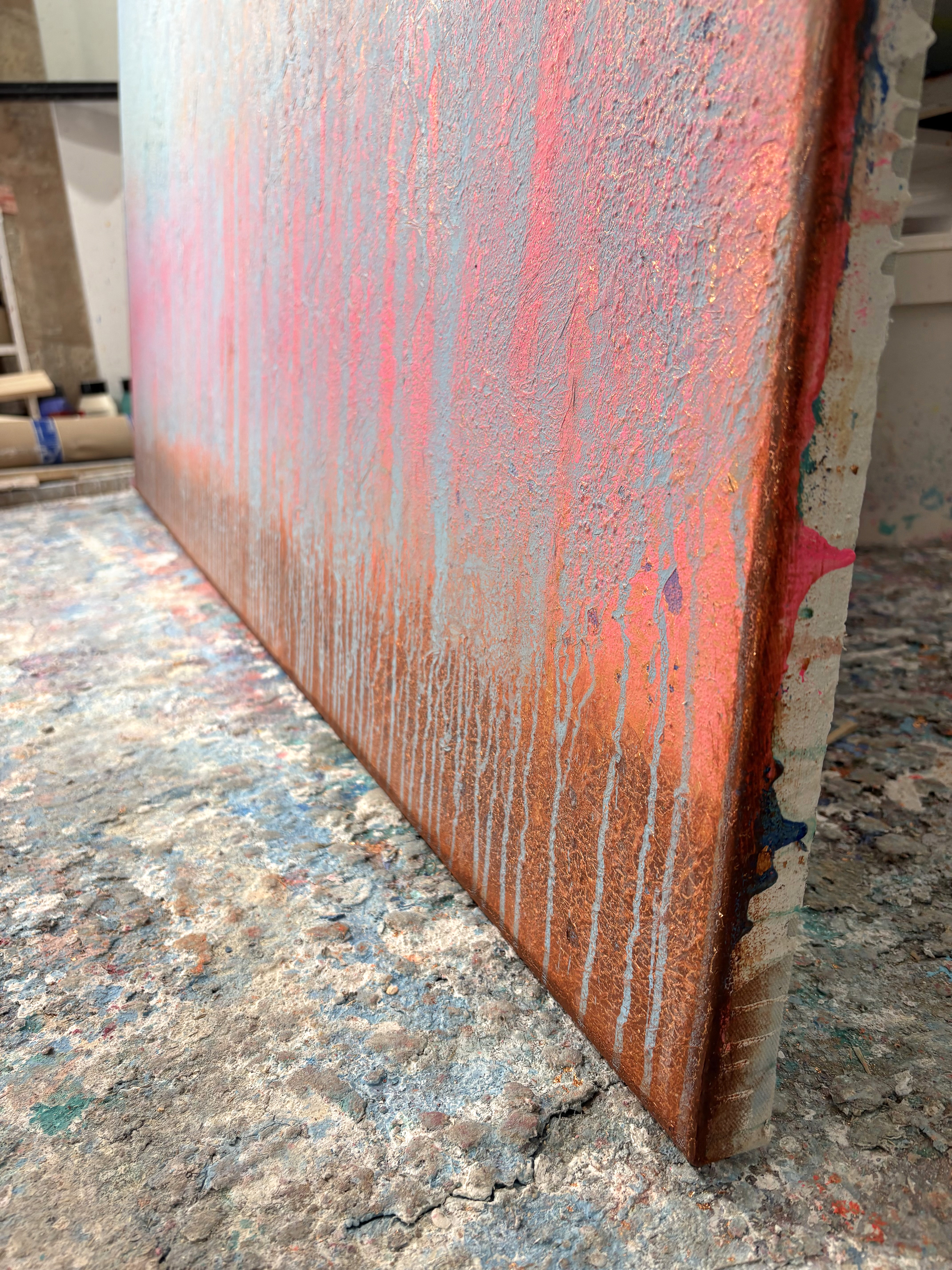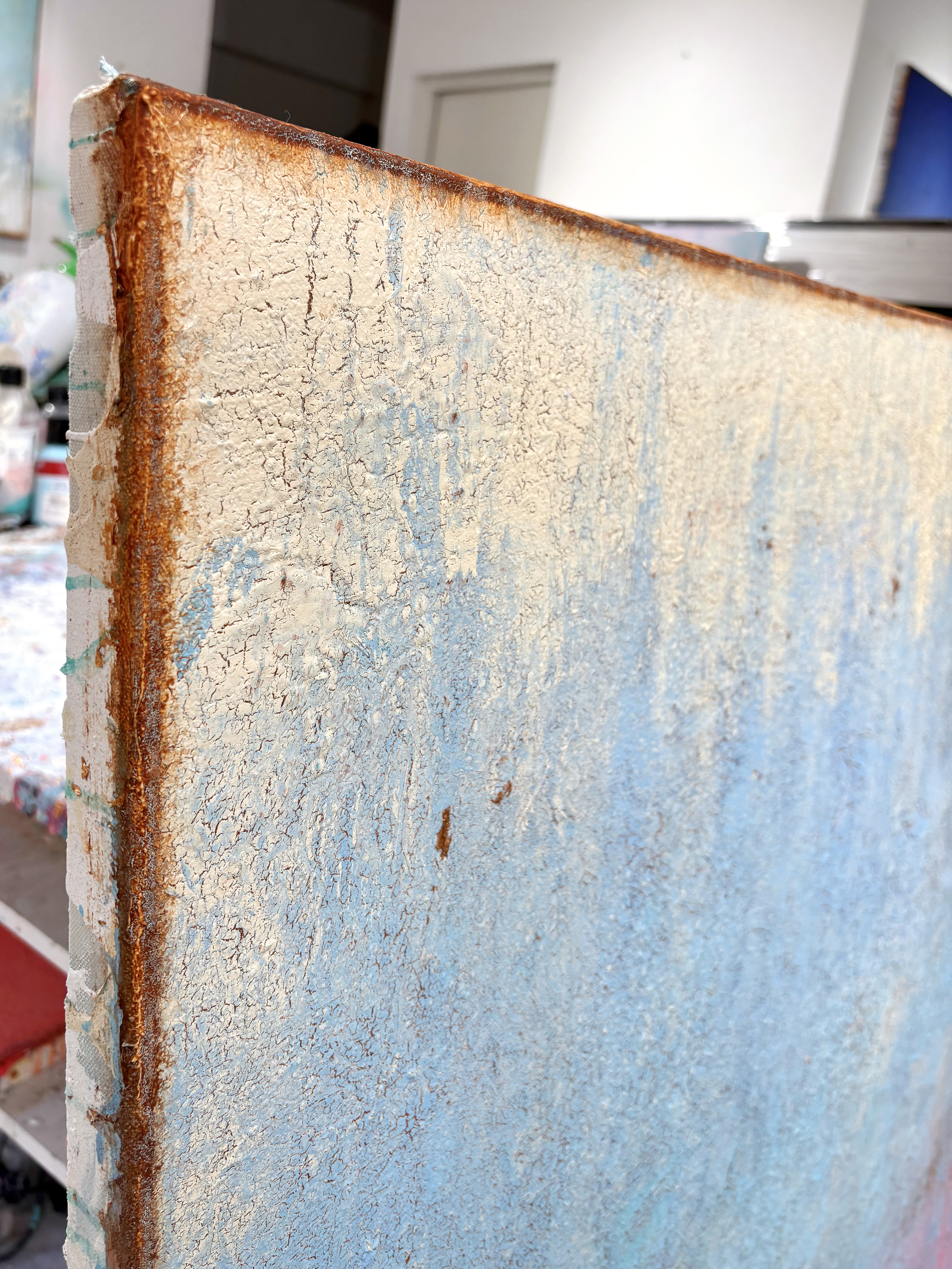 All of my abstract works are original mixed media artworks on canvas, usually consisting of more than 10 layers. Materials I use: Sand, marble powder, foils, acrylics, oil pastel, coal, spray paint and varnish. My goal is to create interesting structures, fine textures and soft color harmonies for an emotional perception.