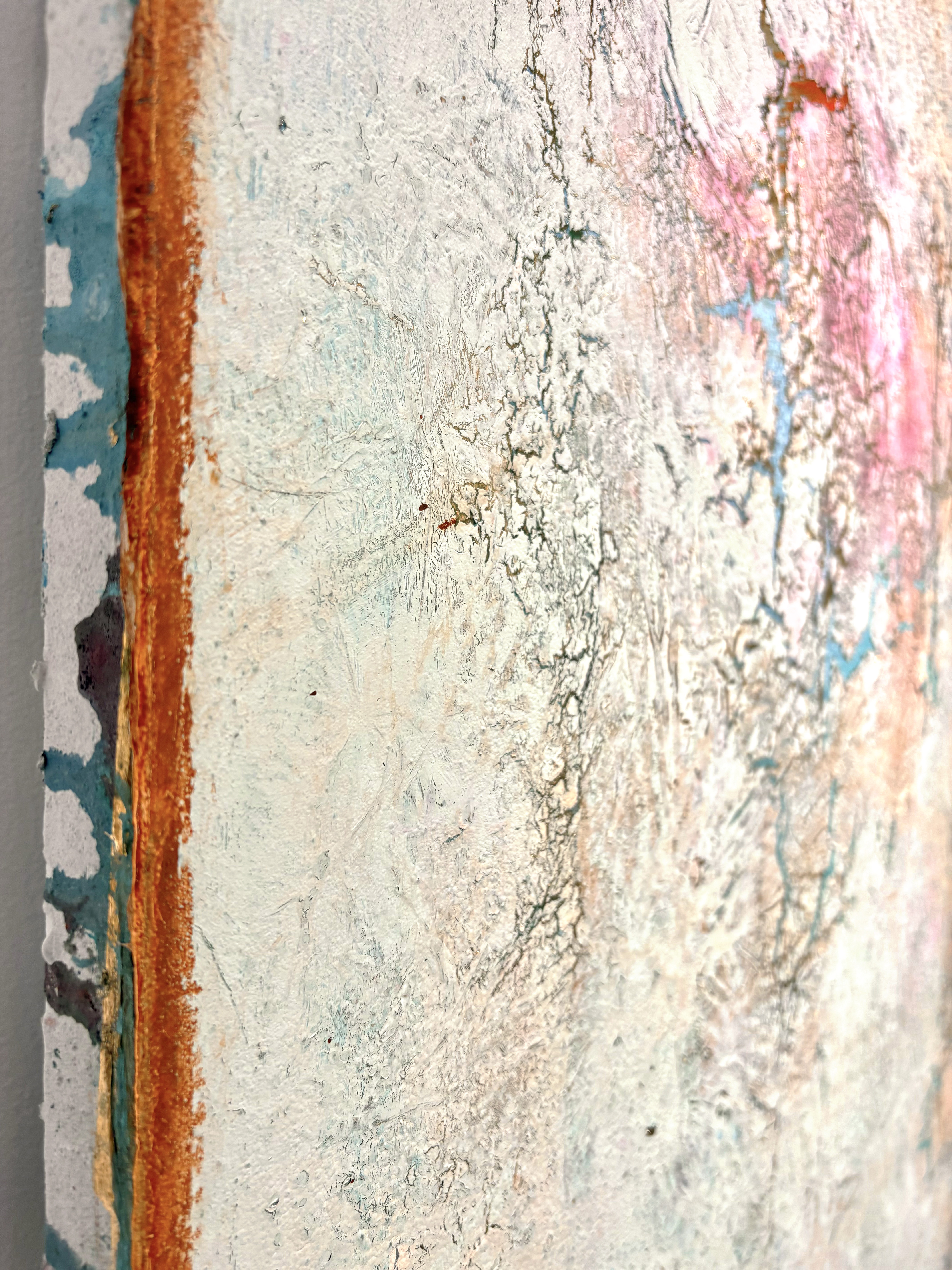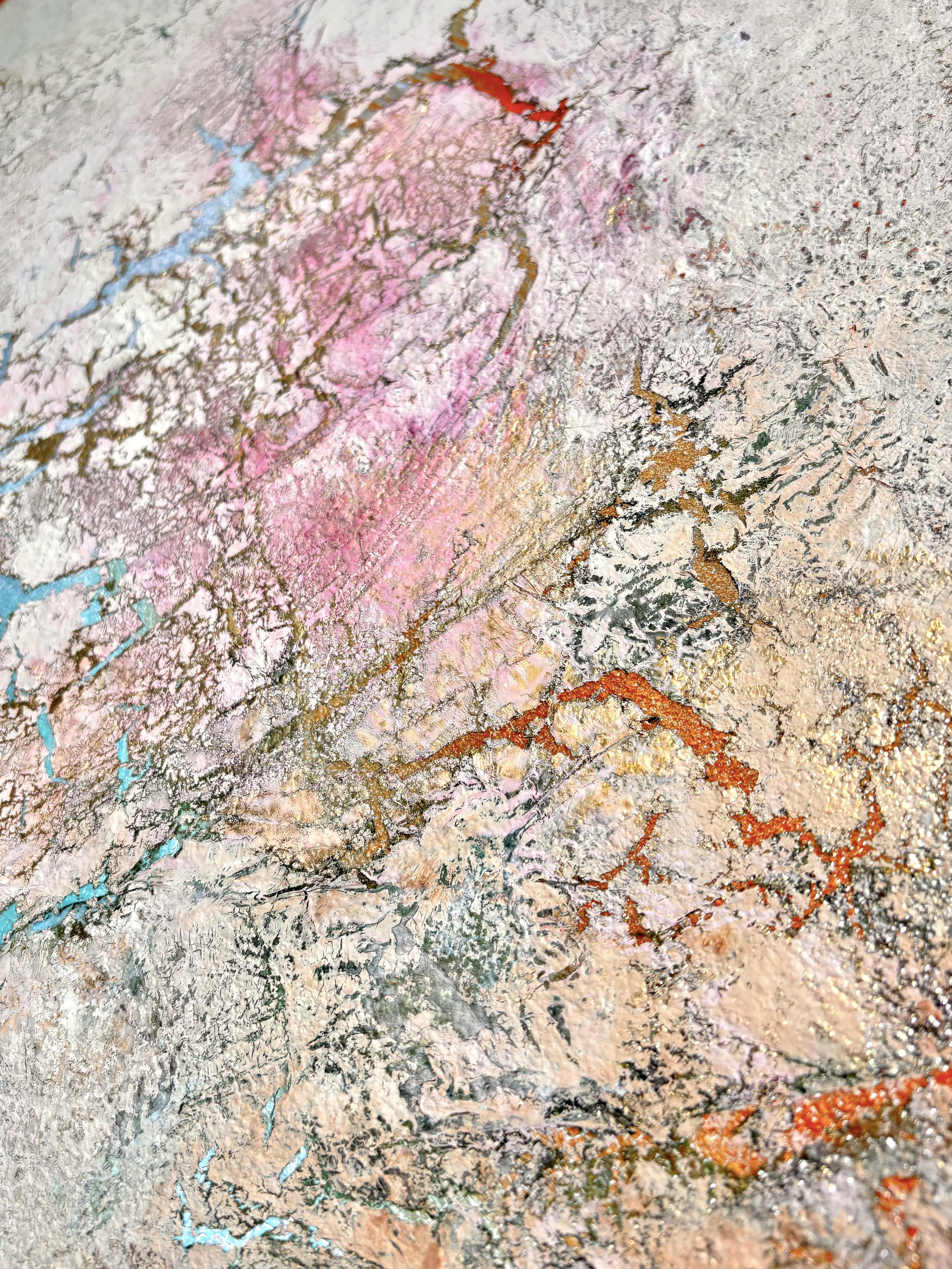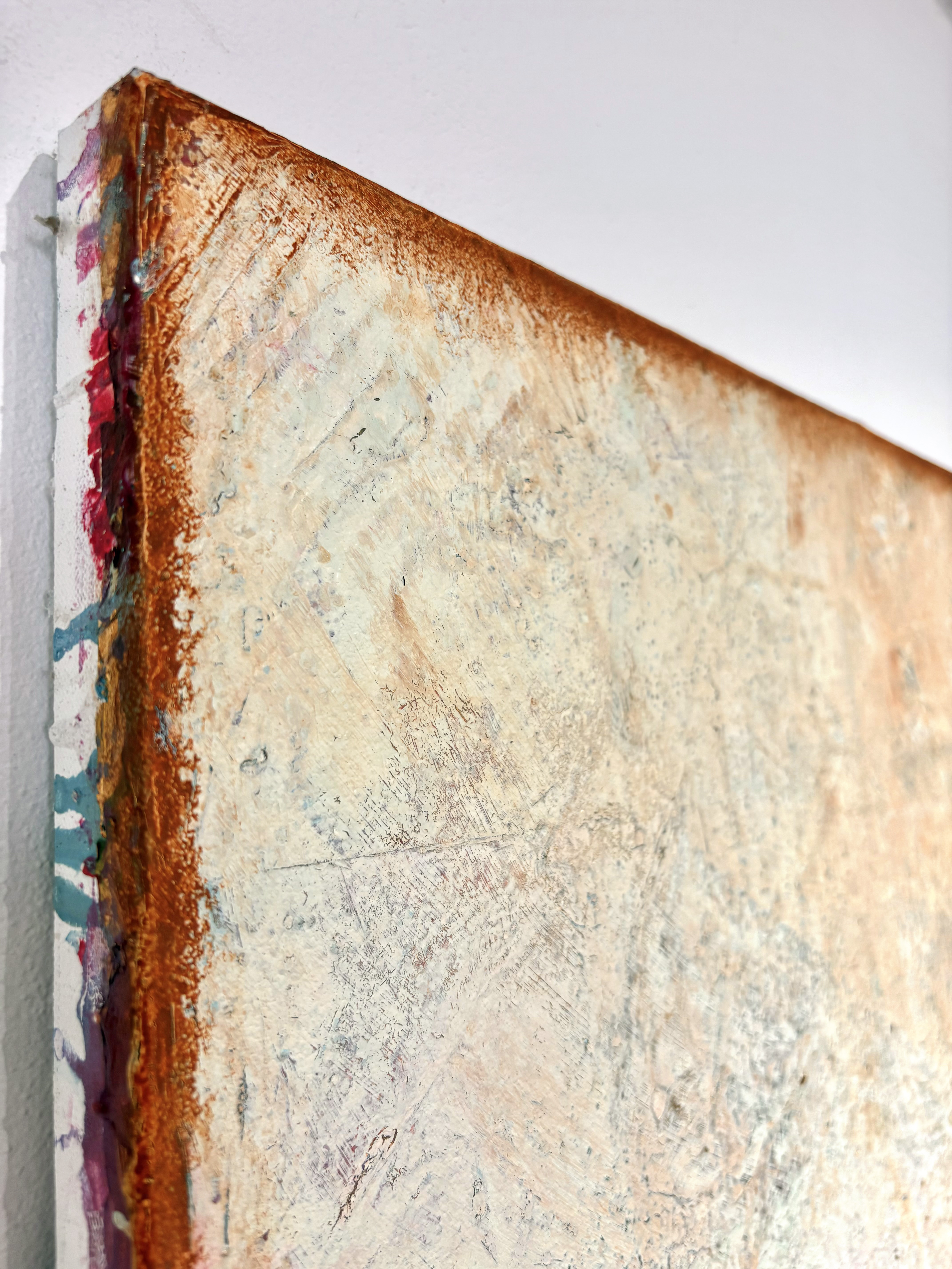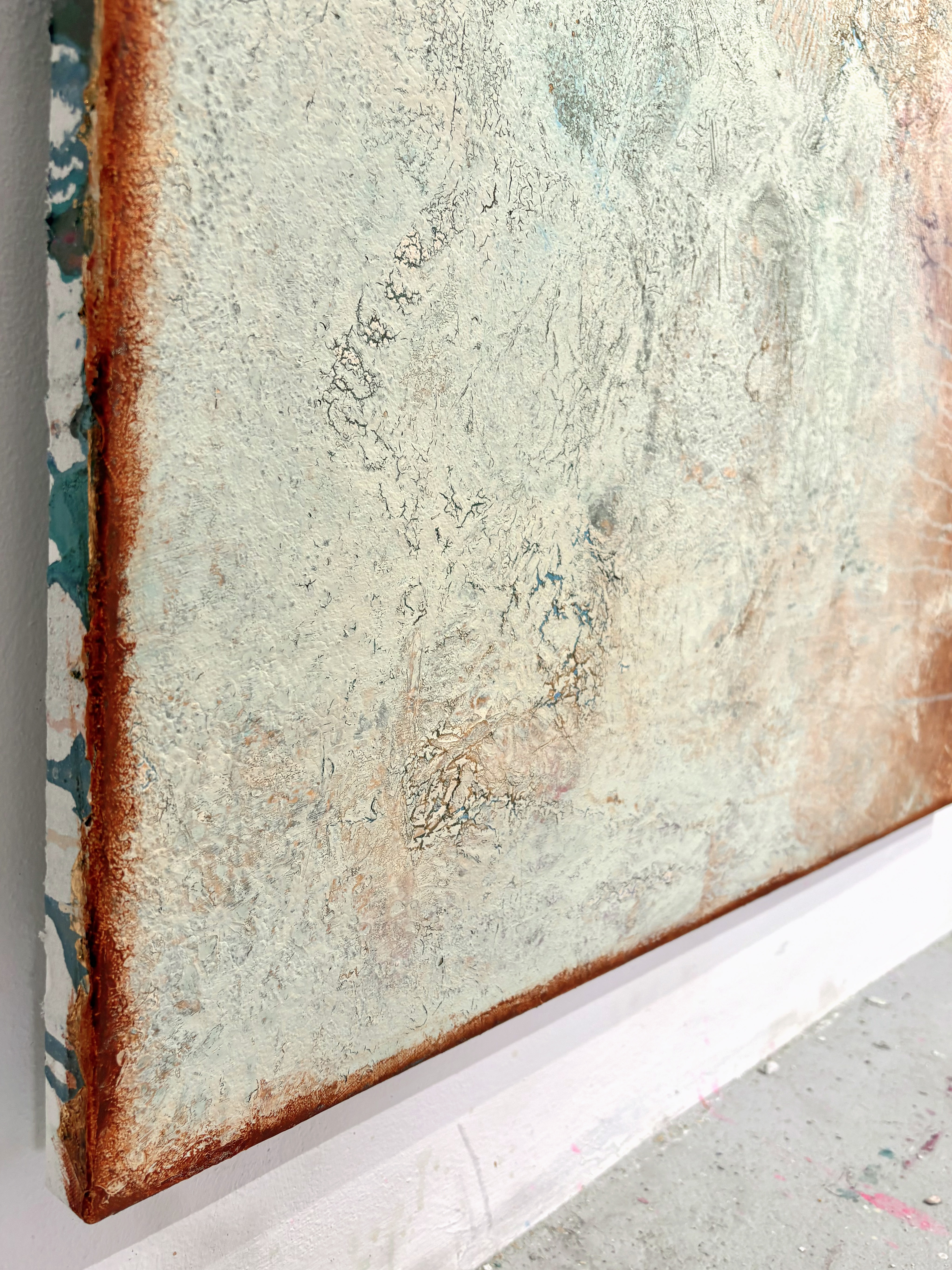 All of my abstract works are original mixed media artworks on canvas, usually consisting of more than 10 layers. Materials I use: Sand, marble powder, foils, acrylics, oil pastel, coal, spray paint and varnish. My goal is to create interesting structures, fine textures and soft color harmonies for an emotional perception.